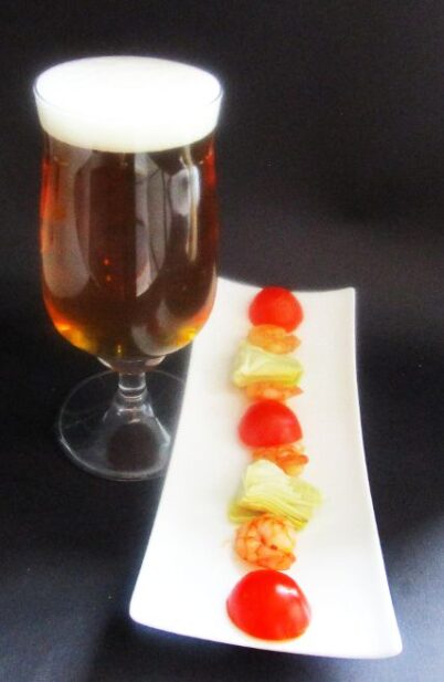 Pils, witbier, Weizen, blond bier tussen 5 en 8 vol%, Saison, Session India Pale Ale tussen 3 en 5 vol%. De frisse en vaak fruitige smaak van deze bieren past goed bij de licht pikante toets van de garnalen in combinatie met de frisse toets van de kerstomaatjes, verkregen door het citroen- of limoensap.